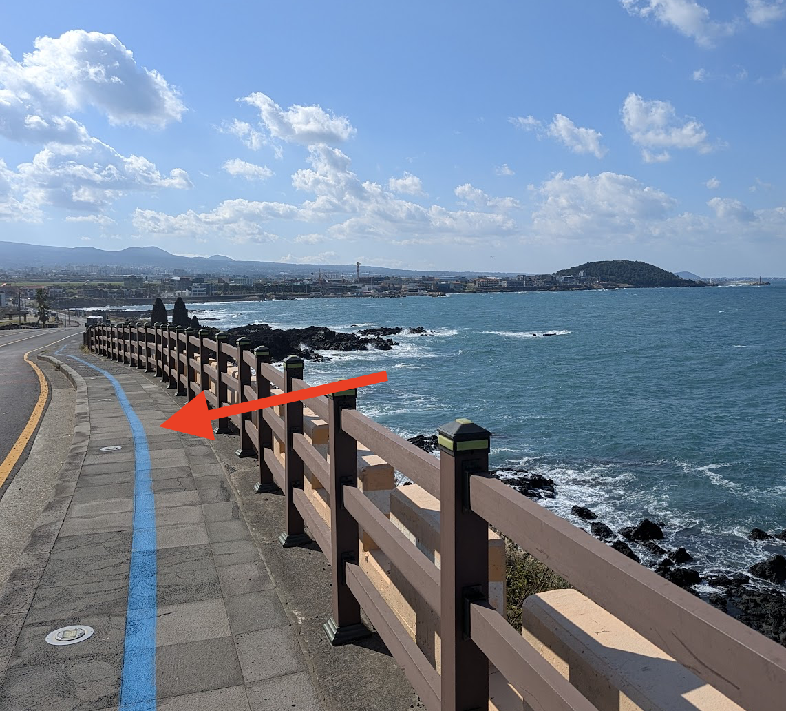 사진에 표시한 인도의 파란 선이 공식 제주환상자전거길 코스 표시입니다. 여행 내내 이 선을 따라 달리는 게 기본이 될 겁니다. 표시는 대체로 진하게 잘 보이는 편이지만, 중간중간 보이지 않거나 희미한 곳도 있어서 앞선 글에서 설명드린 카카오맵 자전거길을 그때그때 참고하시는 것이 좋습니다.