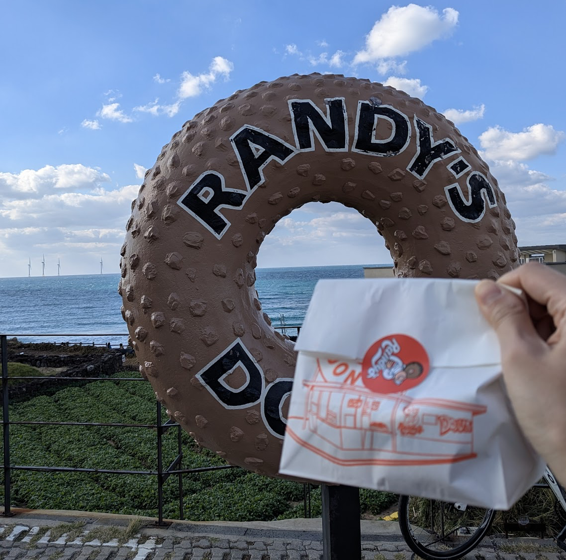 금새 다시 해변길이 나와 따라 달리다 보면, '랜디스도넛 애월점'이 보입니다. 당 충전을 위해 '어쩔 수 없이' 도넛을 먹습니다. 참고로 랜디스도넛 앞에 펼쳐져 있는 녹차밭은 제주도 전체 경관 중에서도 손꼽히는 정말 근사한 풍경입니다. 잠시 쉬다 가시면 후회하지 않으실 겁니다.