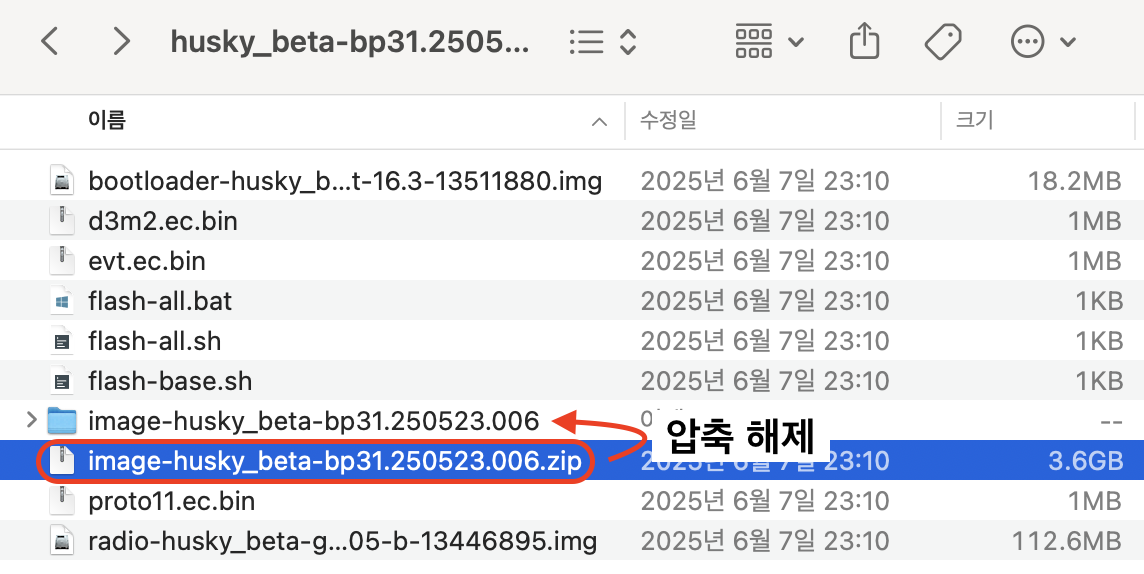 잘못 받은 것이 아니라, 마지막에 제가 언급한 'image-(기기 코드명)-(빌드 버전).zip' 파일을 한번 더 압축 해제해야 아래처럼 원하는 파일이 나옵니다.
