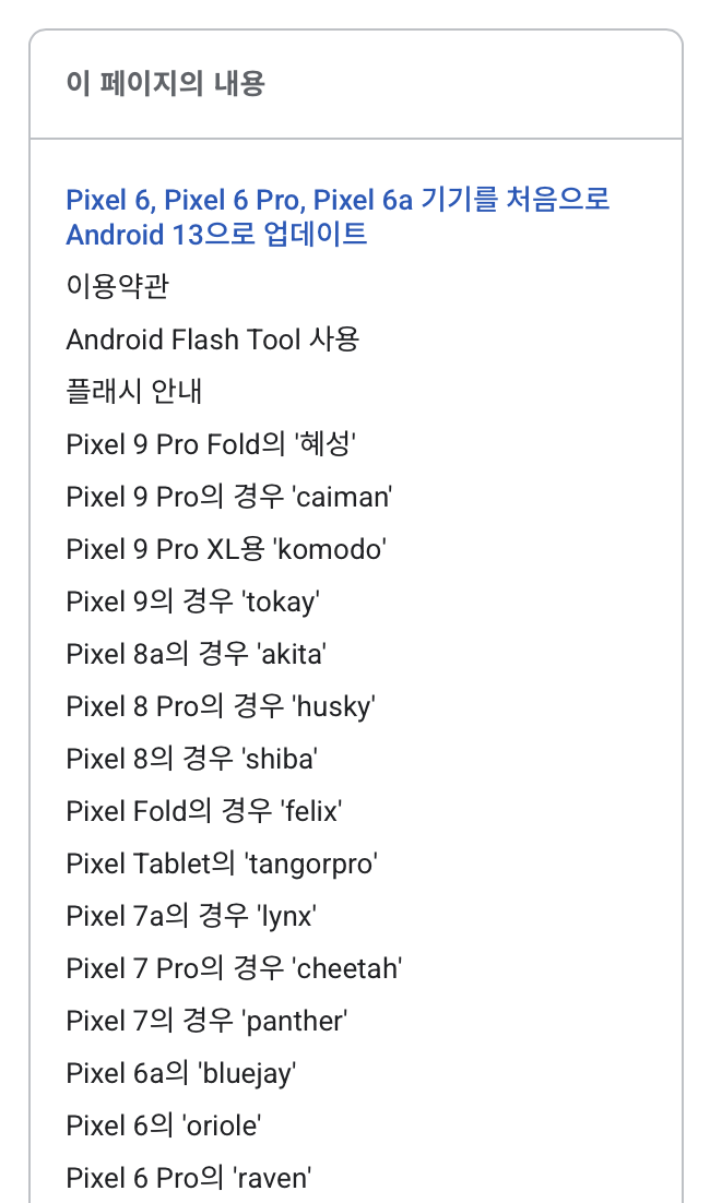 이 목록에서 자신의 픽셀 모델을 찾아 클릭하면 됩니다. 정확한 모델명은 픽셀 폰에서 설정 - 휴대전화 정보로 들어가면 찾을 수 있습니다.