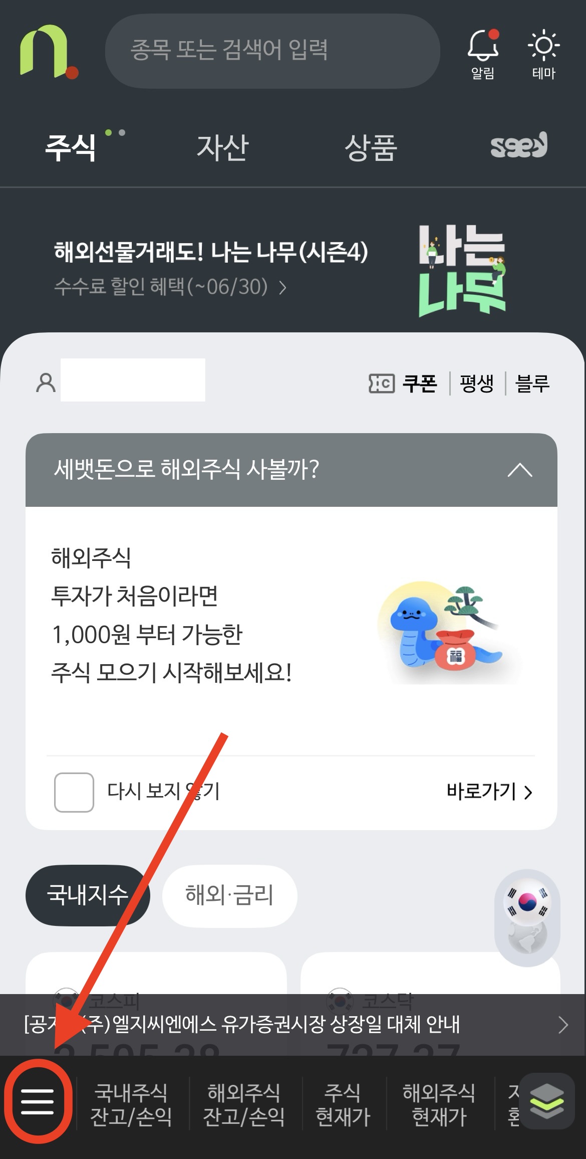 나무증권 앱에서 왼쪽 아래 햄버거 메뉴(선 세개)를 누른 후 검색창에 '보안'을 입력하세요.