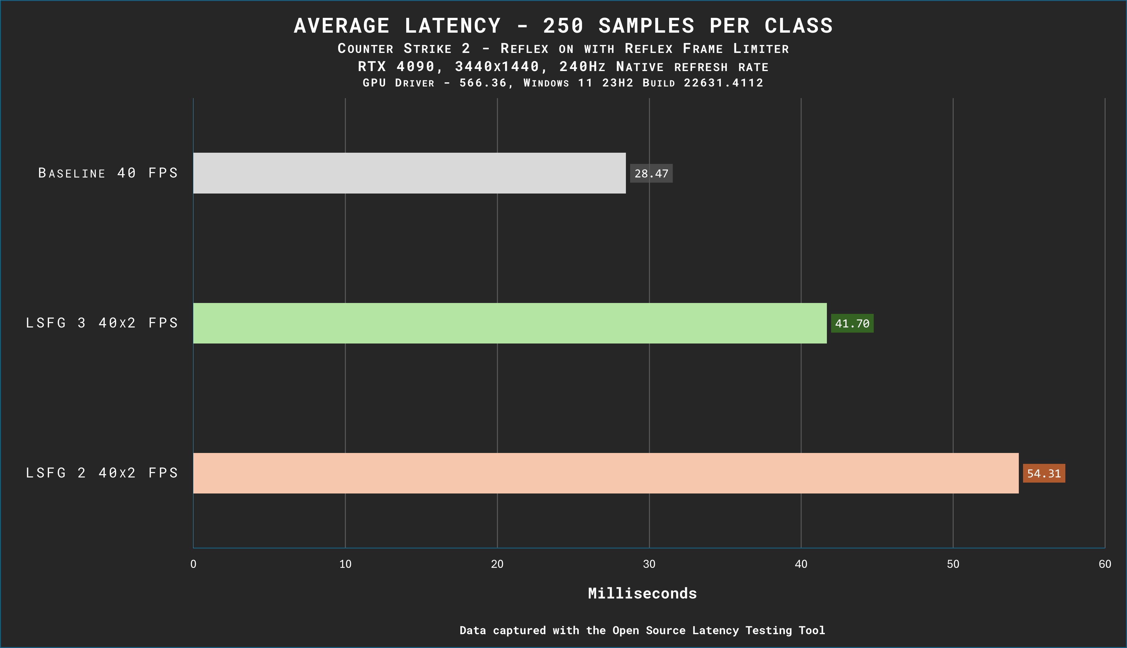 LSFG 2에서는 지연 시간이 2배 가량 늘어났던 것에 비해 3를 사용하면 40% 정도 늘어나는 정도입니다.