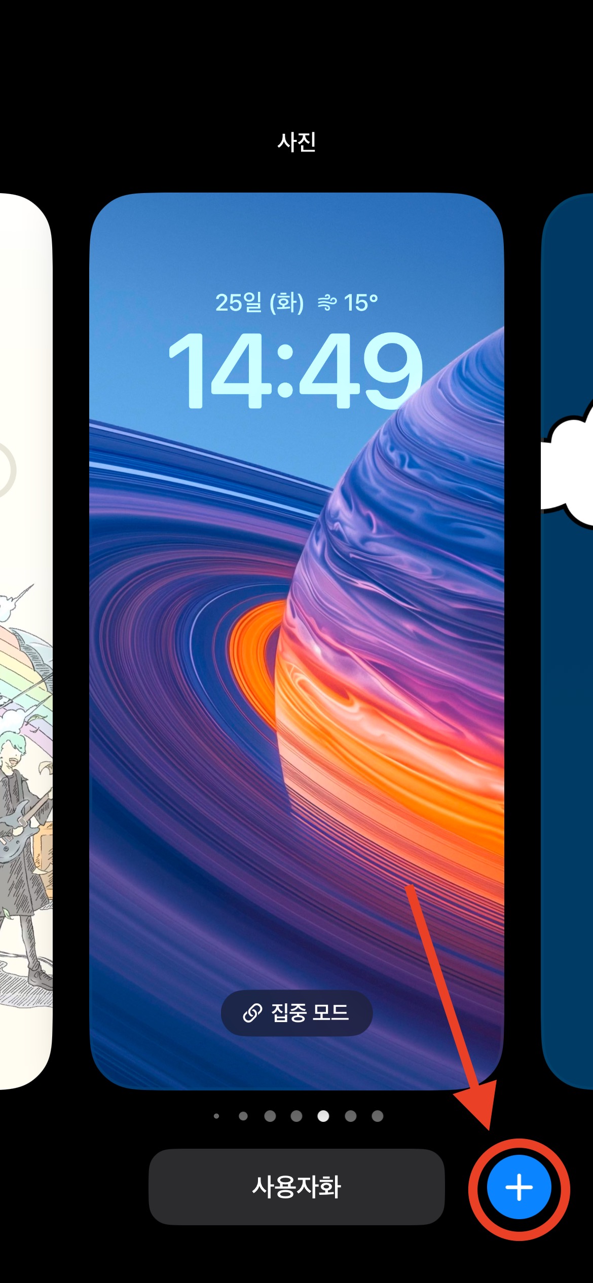 이제 설치한 배경화면을 설정하겠습니다. 잠금화면 상태에서 빈 화면을 꾹 눌러 편집기를 활성화한 뒤, 오른쪽 아래 + 버튼을 누르세요.