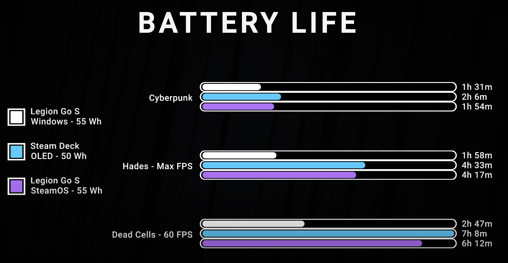 다시 말하지만, 스팀OS 버전과 윈도우 버전의 사양은 완전히 같습니다. 운영체제만 스팀OS로 바꿨더니 배터리 지속 시간이 두 배로 늘어난 것입니다.