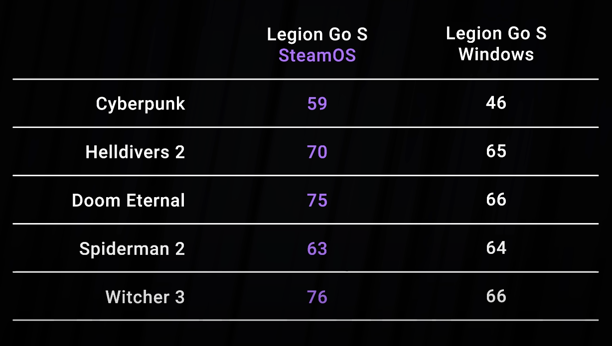 레노버 내부에서 측정한 벤치마크 자료입니다. 중앙 기준으로 왼쪽이 스팀OS, 오른쪽이 윈도우입니다. 같은 조건에서 일관되게 20% 가량의 성능 향상이 있으며, 일부 게임의 경우 윈도우에서는 구동되지 않는 게임이 오히려 스팀OS에서는 구동되는 기현상을 보여 줍니다.