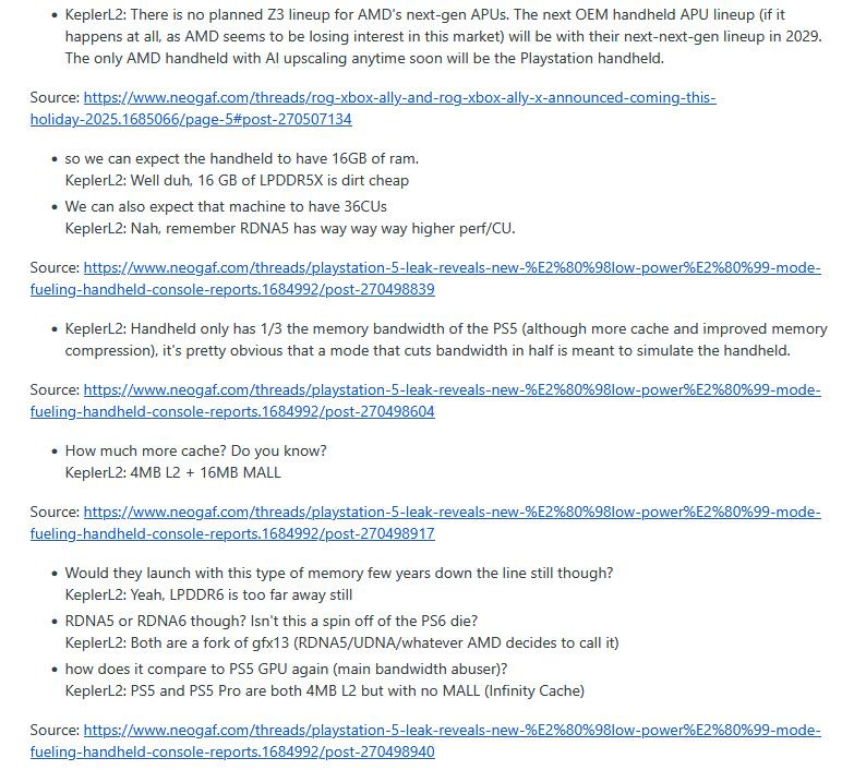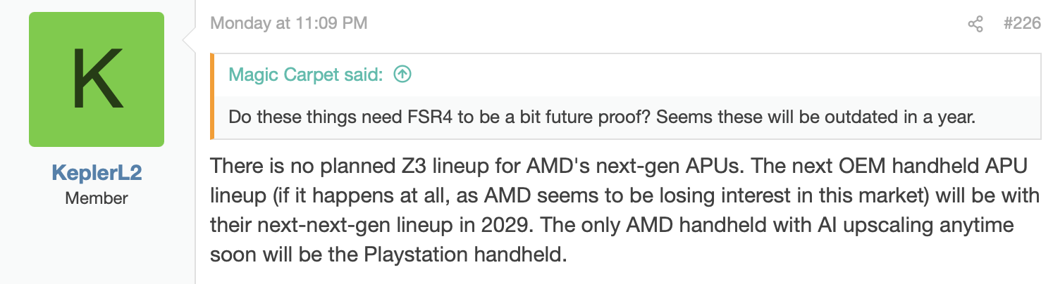 이 스펙 자체는 루머이기도 하고, 아직 개발 초기 단계일 거라 확정된 것도 아니여서 그렇구나 정도로 보시면 됩니다.KeplerL2의 말에서 신경 쓰이는 부분은 아래와 같습니다."AMD의 차세대 APU에서는 Z3 라인업이 나오지 않는다. AMD는 핸드헬드 APU 시장에 흥미를 잃어가고 있으며, 만약 Z3가 나온다고 해도 2029년에 차차세대 라인업에서야 나올 것이다. 한동안 AI 업스케일링을 지원하는 AMD 기반 핸드헬드는 플레이스테이션 핸드헬드가 유일할 것이다."
