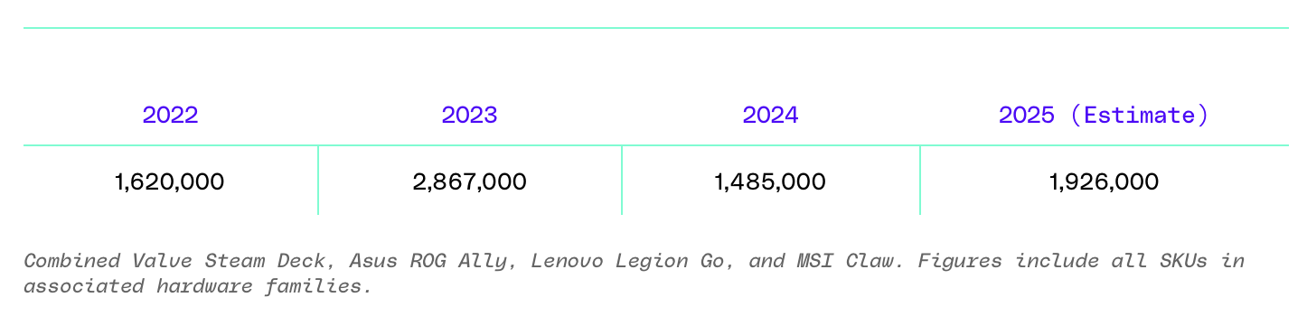 핸드헬드가 새로운 세그먼트로 자리잡고 성장하고 있지만, 절대적인 시장 규모가 아직 작다는 건 엄연한 사실입니다. IDC의 예상에 따르면, 2022년부터 24년까지 3년 간 전세계에서 판매된 핸드헬드는 총 600만대입니다. 스팀 덱, 엘라이, 리전 고 등을 전부 합한 수치입니다. 2025년에 판매될 댓수 예측도 200만대 미만으로, 유의미한 성장도 아직은 보이지 않고 있습니다.