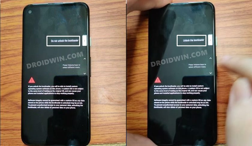 그러면 연결되어 있는 픽셀 화면이 약간 바뀝니다. 아래 사진 왼쪽처럼 전원 버튼 옆에 'Do not unlock the bootloader'라는 글씨가 뜹니다.