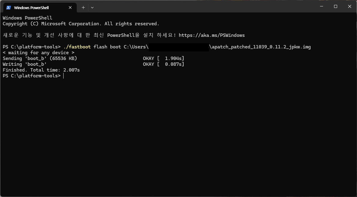 을 입력하고 스페이스바를 한 번 누른 후, 아까 픽셀에서 컴퓨터로 옮겼던 apatch_patched 로 시작하는 .img 파일을 드래그해서 Powershell 창 안에 끌어다 놓습니다. 아래처럼 파일이 명령어 뒤에 제대로 보이면 됩니다.