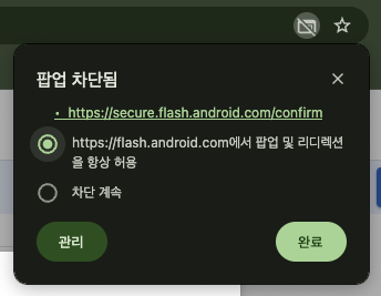 화면이 넘어가면서 위와 같은 창이 뜹니다. 크롬 주소창 오른쪽의 팝업 차단 아이콘을 누르고, 팝업 허용을 선택한 뒤 완료를 누릅니다.
