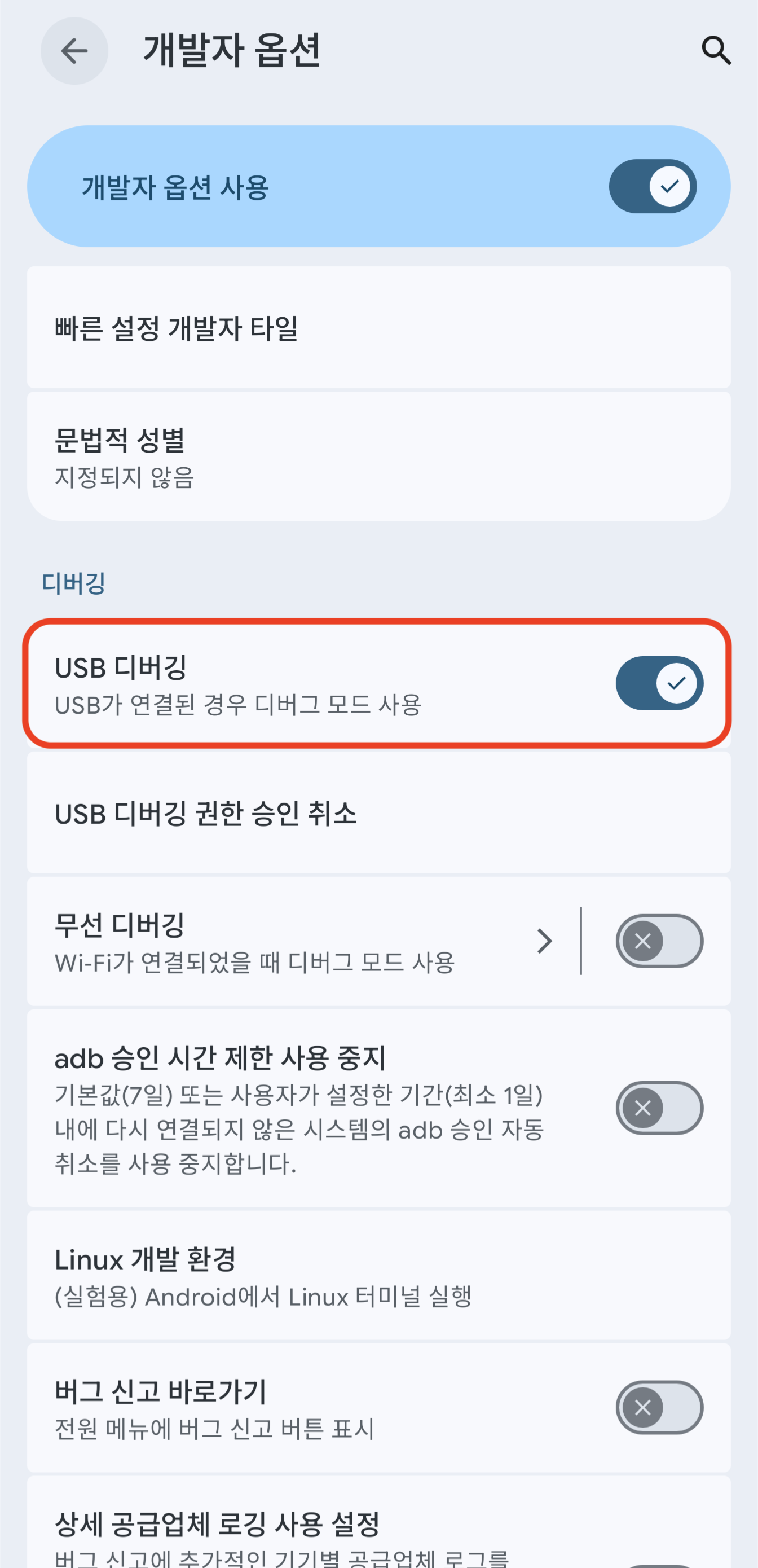다시 설정 앱에서 '시스템'으로 들어가면 '개발자 옵션'이라는 항목이 새로 생겨 있습니다. 들어가서 'USB 디버깅' 항목을 찾아서 켜줍니다.