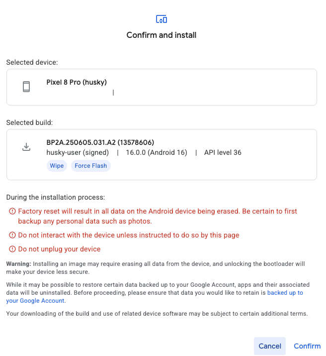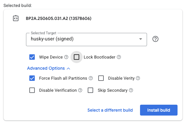 이대로 Install build를 눌러도 되지만, 이럴 경우 기기가 초기화되며(Wipe), 부트로더가 다시 잠기게(Lock) 됩니다.