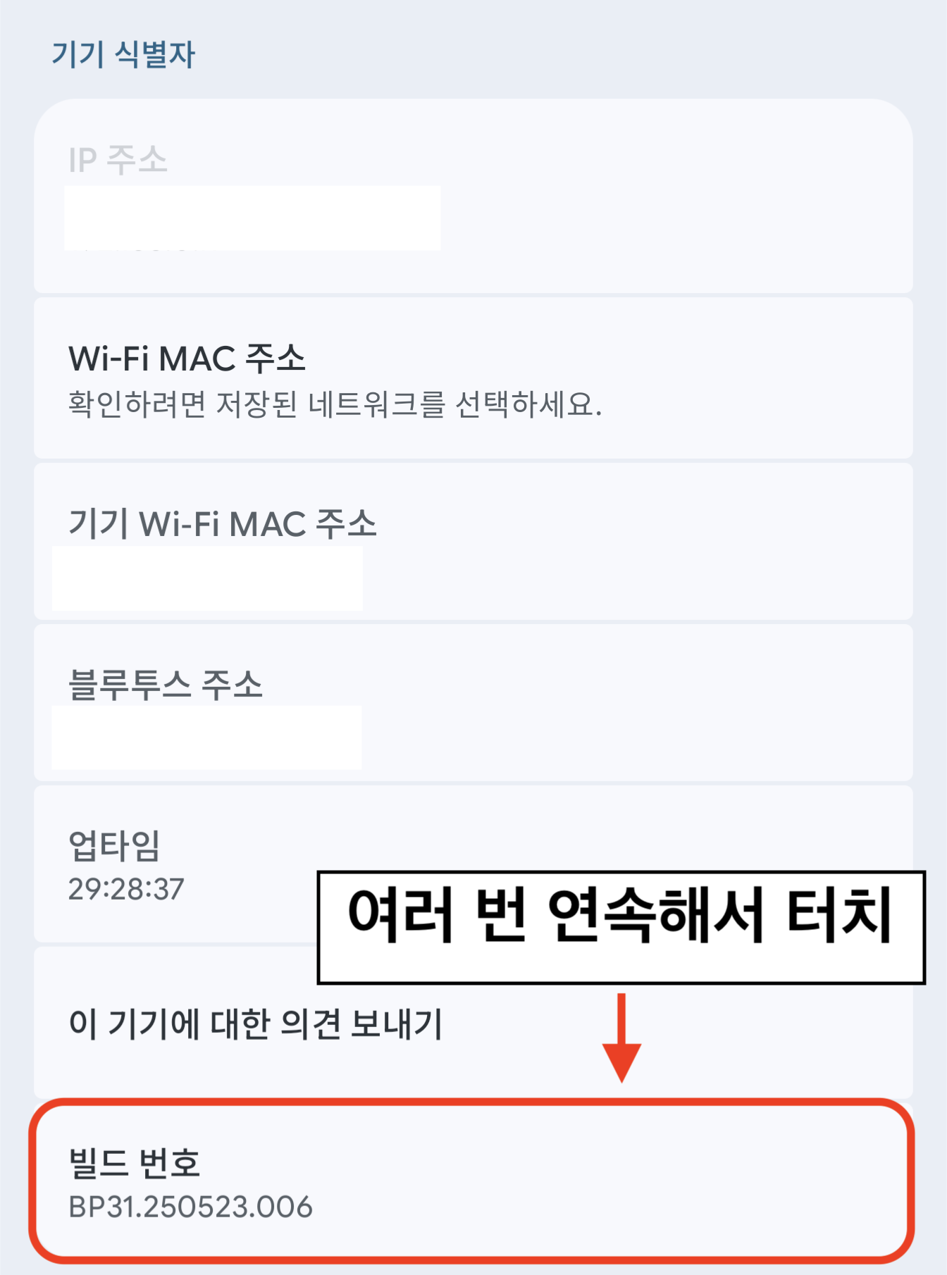 픽셀의 설정 앱에서 휴대전화 정보 로 들어가 맨 아래로 스크롤한 뒤 '빌드 번호' 항목을 연속으로 여러 번 터치합니다. 계속 터치하면 화면 잠금을 입력하는 창이 뜨는데, 입력해 주면 개발자 모드가 활성화됩니다.