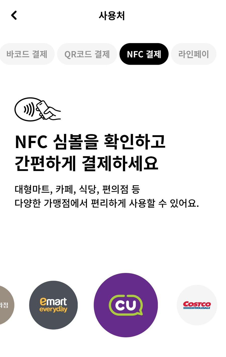 '매장에서 결제' 메뉴로 들어가서 NFC 결제 기능을 활성화하고(최초 활성화 시 20-30초 가량 로딩 필요),