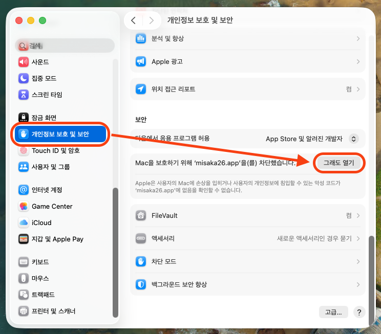 그 다음 macOS 설정에서 '개인정보 보호 및 보안'으로 들어가서 아래로 스크롤하세요. Mac을 보호하기 위해~~ 라고 되어 있는 부분의 오른쪽에서 '그래도 열기'을 클릭한 후, 나오는 창에서 '그래도 열기'를 클릭하세요. 그러면 misaka26이 실행됩니다.