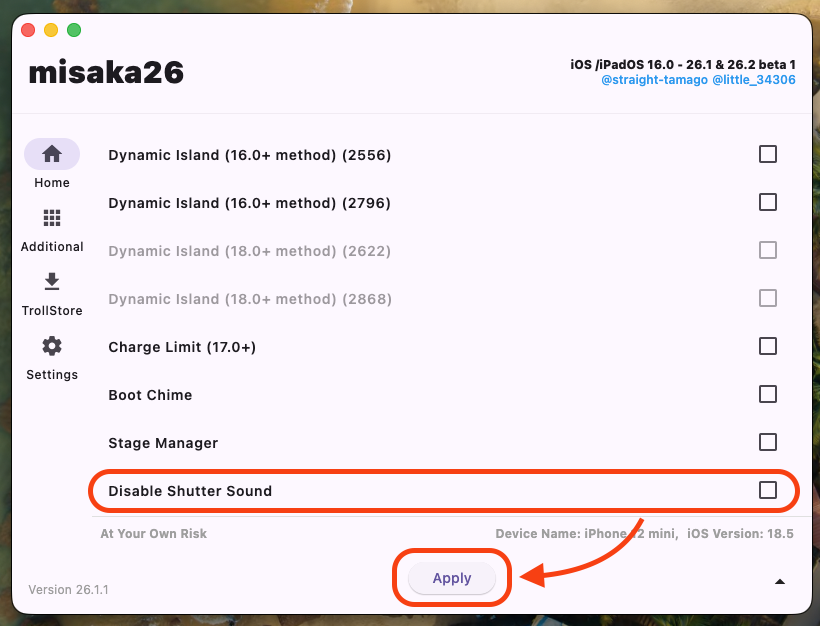 그러나 이번에 새로 나온 misaka26 을 사용하면 최신 아이폰, 최신 iOS에서도 간단하게 아이폰 카메라 무음을 만들 수 있습니다. iOS 26.1이 설치된 아이폰 17 프로에서도 카메라 무음을 탈옥 없이 만들 수 있습니다.