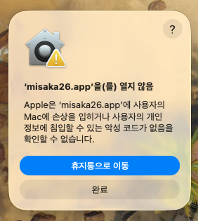 가끔 misaka26이 손상되었다는 메세지가 나올 때도 있는데, 이때는 macOS '터미널' 앱을 열고 아래 명령어를 실행한 뒤 다시 실행하면 잘 열립니다.