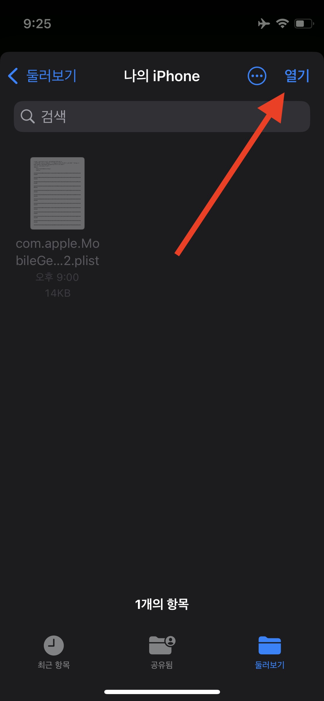 그러면 아래와 같이 MobileGestalt 파일을 저장하는 팝업이 뜨는데요. 여기서 아래 탭의 '둘러보기'를 누르고, 적당한 위치에 들어가 저장해주면 됩니다. 저는 아래처럼 '나의 아이폰'에 들어가서 '열기' 버튼을 눌러 저장했습니다.
