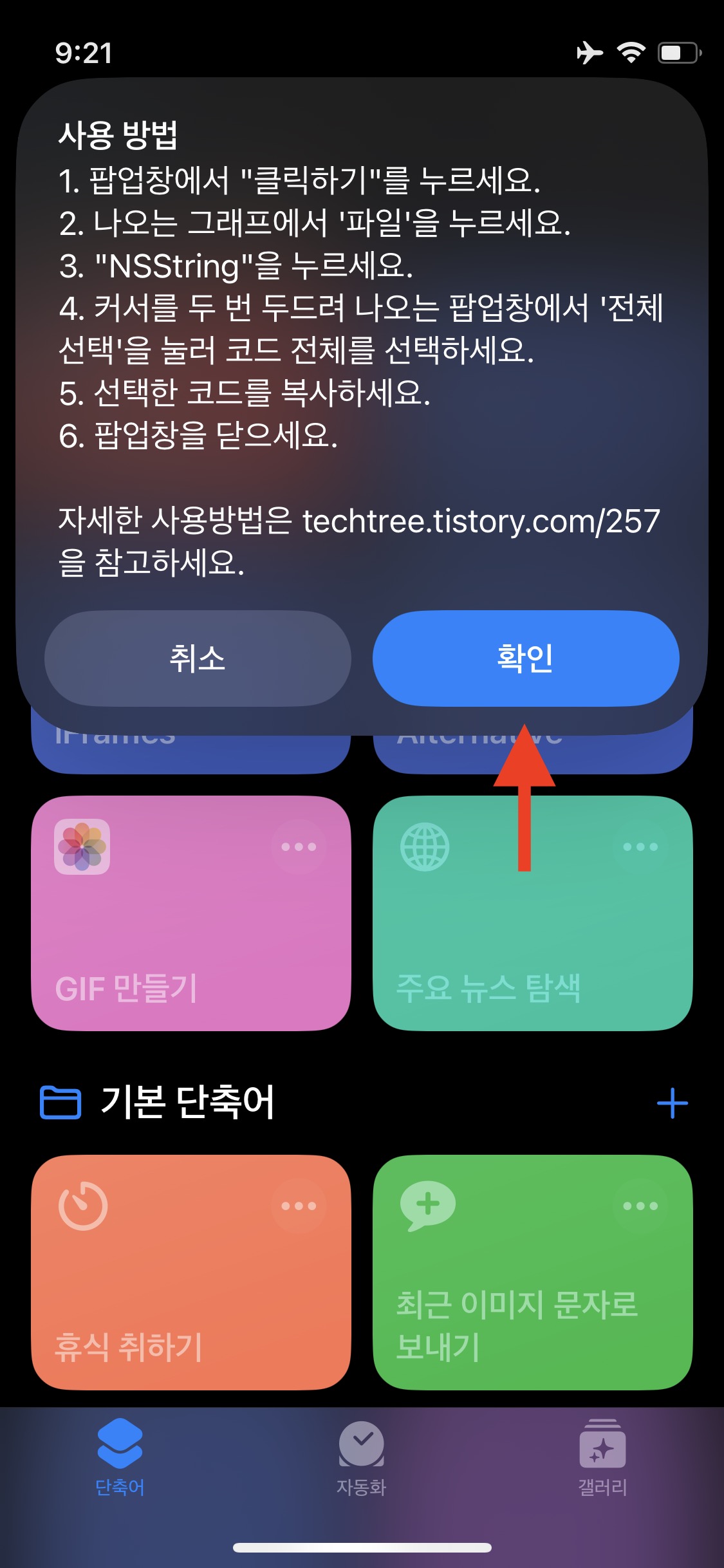 단축어 앱에서 다운받은 단축어를 눌러 실행합니다. 사용방법을 알려주는 팝업창이 뜹니다. 확인을 누릅니다.