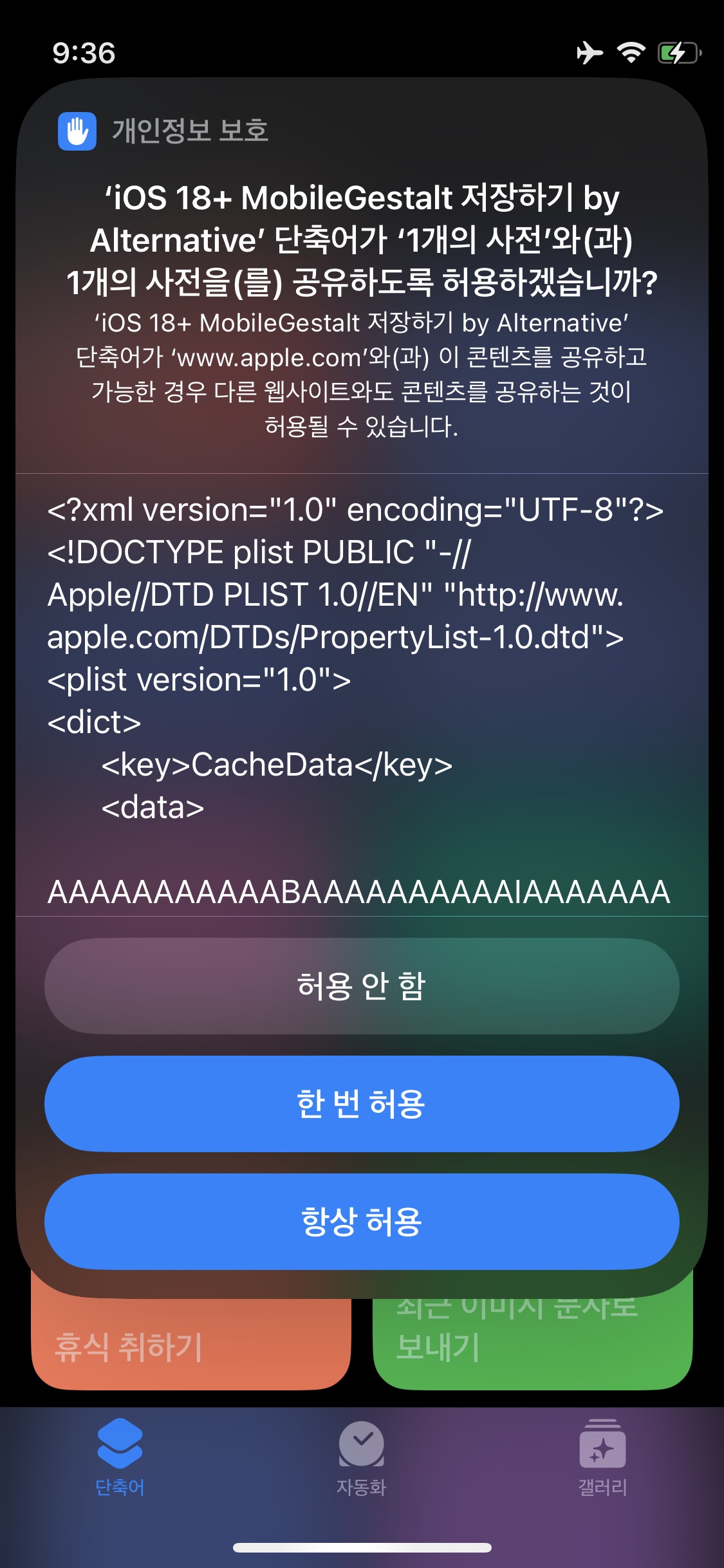 이러면 MobileGestalt 파일이 잘 저장되고, 그 다음 공유를 위한 팝업이 뜹니다. 처음 실행 시라면 아래처럼 권한을 묻는 팝업이 먼저 뜰 수 있습니다. '항상 허용'을 누르면 됩니다. 그 후 뜨는 공유 창에서 에어드랍이나 이메일, 카카오톡을 통해 컴퓨터로 MobileGestalt 파일을 전송하면 됩니다.