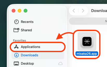 우선 파일 탐색기로 다운받은 misaka26.app을 '응용 프로그램' 폴더로 옮겨 주세요.