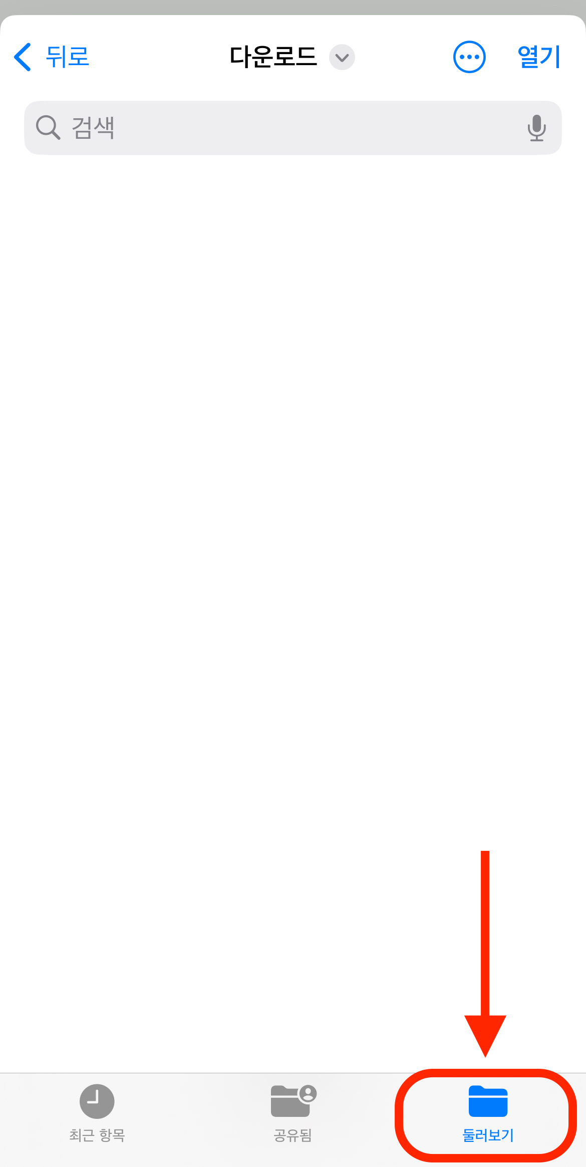 해당 화면에서 오른쪽 아래에 있는 '둘러보기' 탭을 누르고 '나의 iPhone'이나 'iCloud Drive - 다운로드' 로 들어가면 열기 버튼을 누를 수 있게 됩니다.