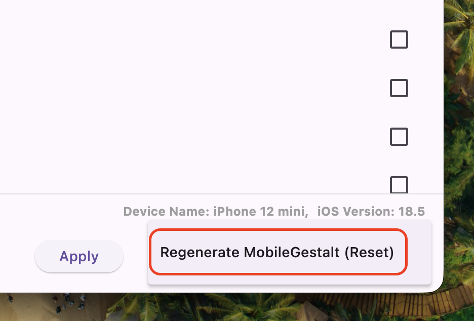 아이폰/아이패드를 컴퓨터에 연결하고 misaka26에서 오른쪽 아래에 있는 삼각형 버튼을 누르세요. 'Regenerate MobileGestalt (Reset)' 버튼을 누르면 재부팅되면서 모든 트윅이 해제됩니다.