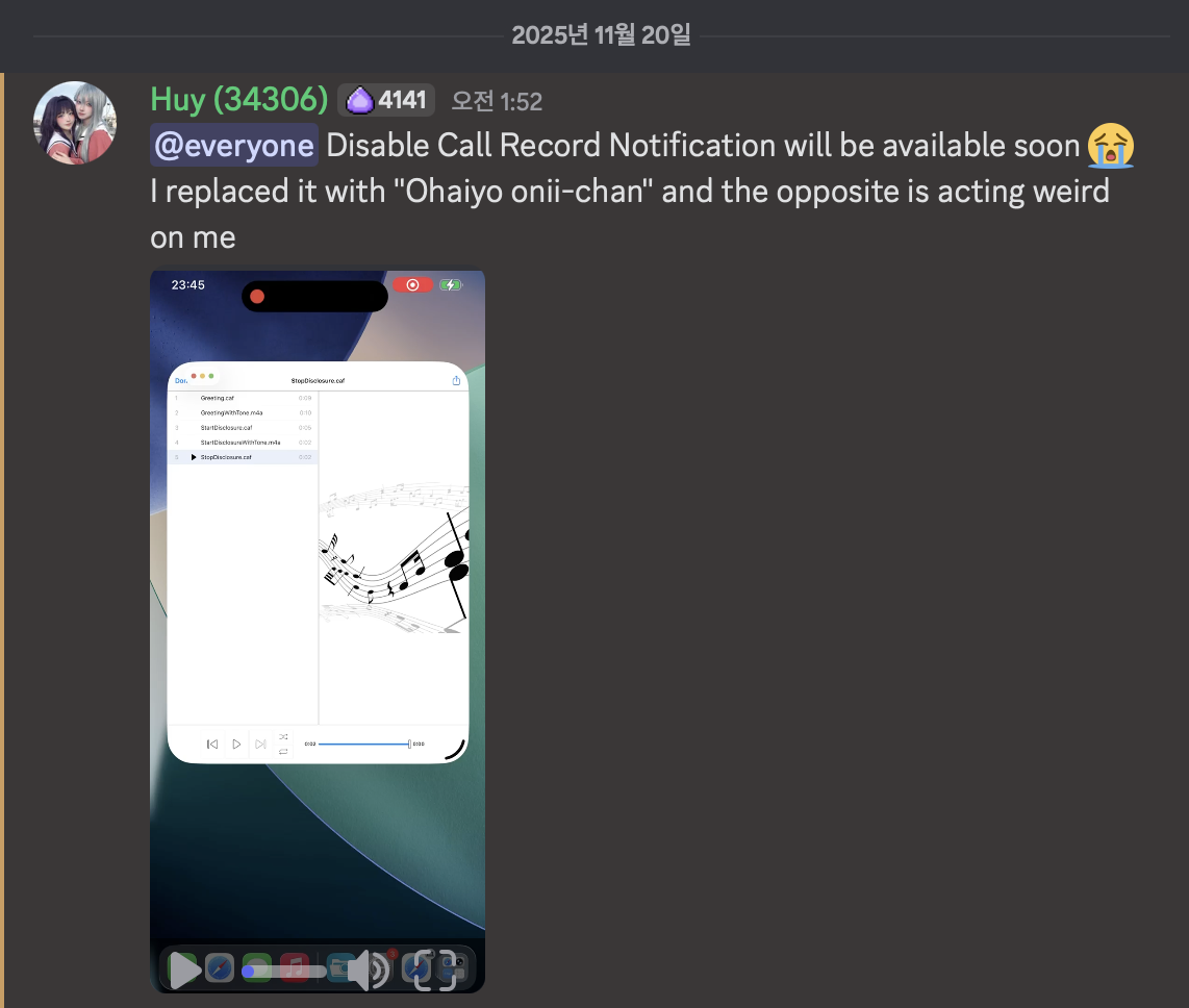 통화 녹음 고지를 없애는 트윅이 곧 출시될 예정입니다.