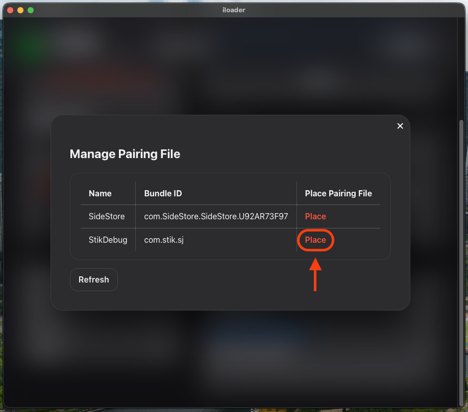 아래처럼 SideStore와 Stikdebug 두 앱이 뜹니다. Stikdebug 옆에 있는 빨간색 Place 버튼을 누르세요.