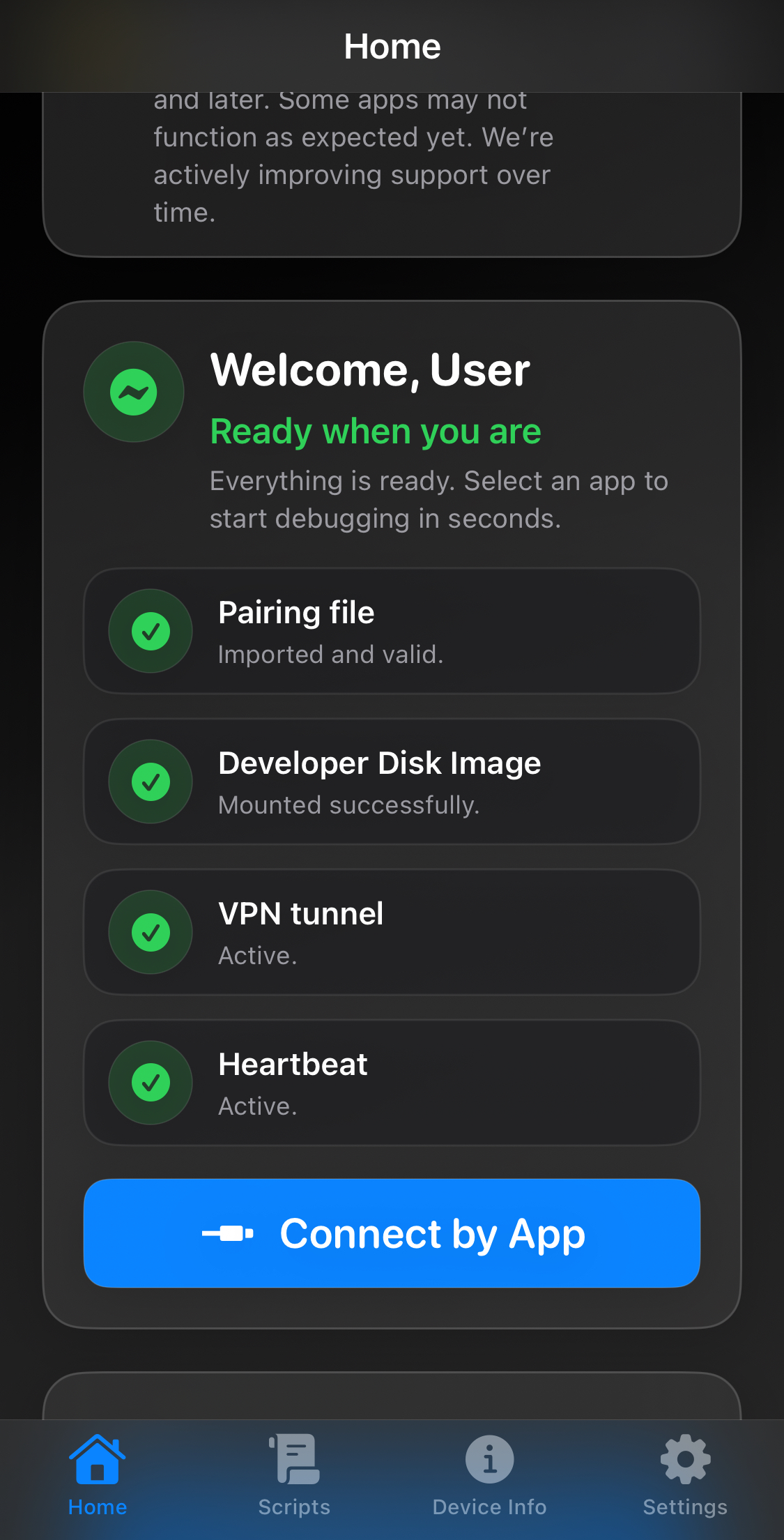 아이폰에서 Stikdebug 앱을 종료하고, 다시 실행합니다. 이때 아이폰은 와이파이에 연결되어 있는 상태여야 합니다.