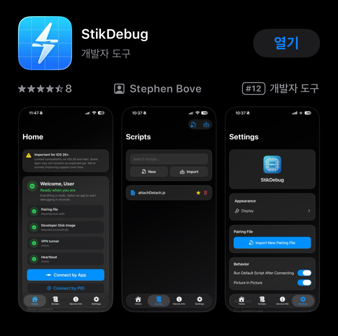 아이폰 앱스토어에서 Stikdebug 앱을 검색해 설치해주세요. 앱을 열어서 Continue를 누른 뒤 VPN 구성 추가를 허용해주면 됩니다.
