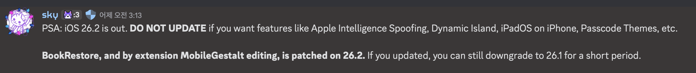 만약 업데이트를 원치 않는데 이미 업데이트되었다면 아래 글을 참고하셔서 빠르게 다운그레이드를 진행하시기 바랍니다. 약 5일-1주일 동안은 26.1의 사이닝 서버가 열려 있을 것이나, 더 빠르게 닫힐 수 있기 때문에 빠르게 결정하시는 것을 추천드립니다.