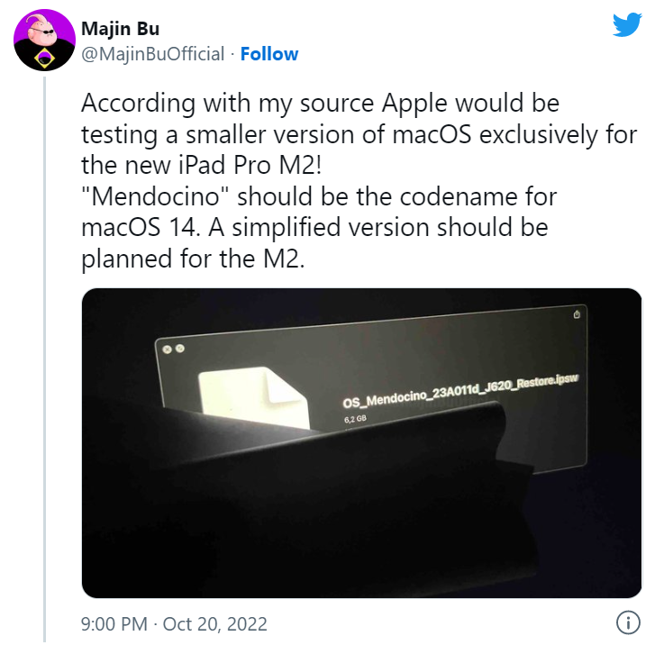 Majin Bu는 발언과 함께 아이패드용 macOS의 코드네임인 Mendocino를 스크린샷과 함께 공개했습니다. 공개된 스크린샷에서, 해당 OS는 기존 iOS/iPadOS의 OS 설치파일 형식과 같은 IPSW임을 확인할 수 있습니다.