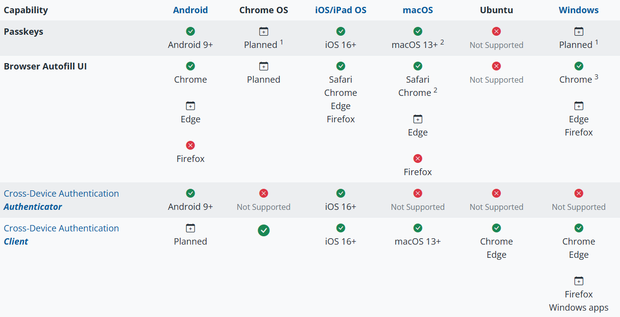 패스키 공식 웹사이트에서 밝힌 각 운영체제/소프트웨어별 지원 여부는 아래와 같습니다.