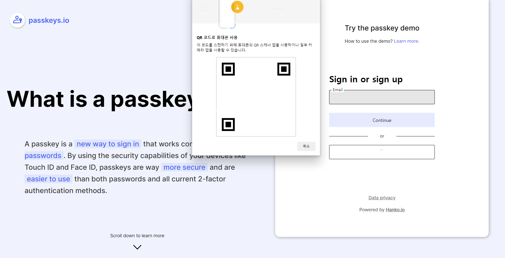 패스키 솔루션을 개발하는 Hanko라는 보안 솔루션 기업에서는, 누구나 패스키를 쉽게 이용해볼 수 있도록 간단한 패스키 데모 사이트를 만들었습니다.