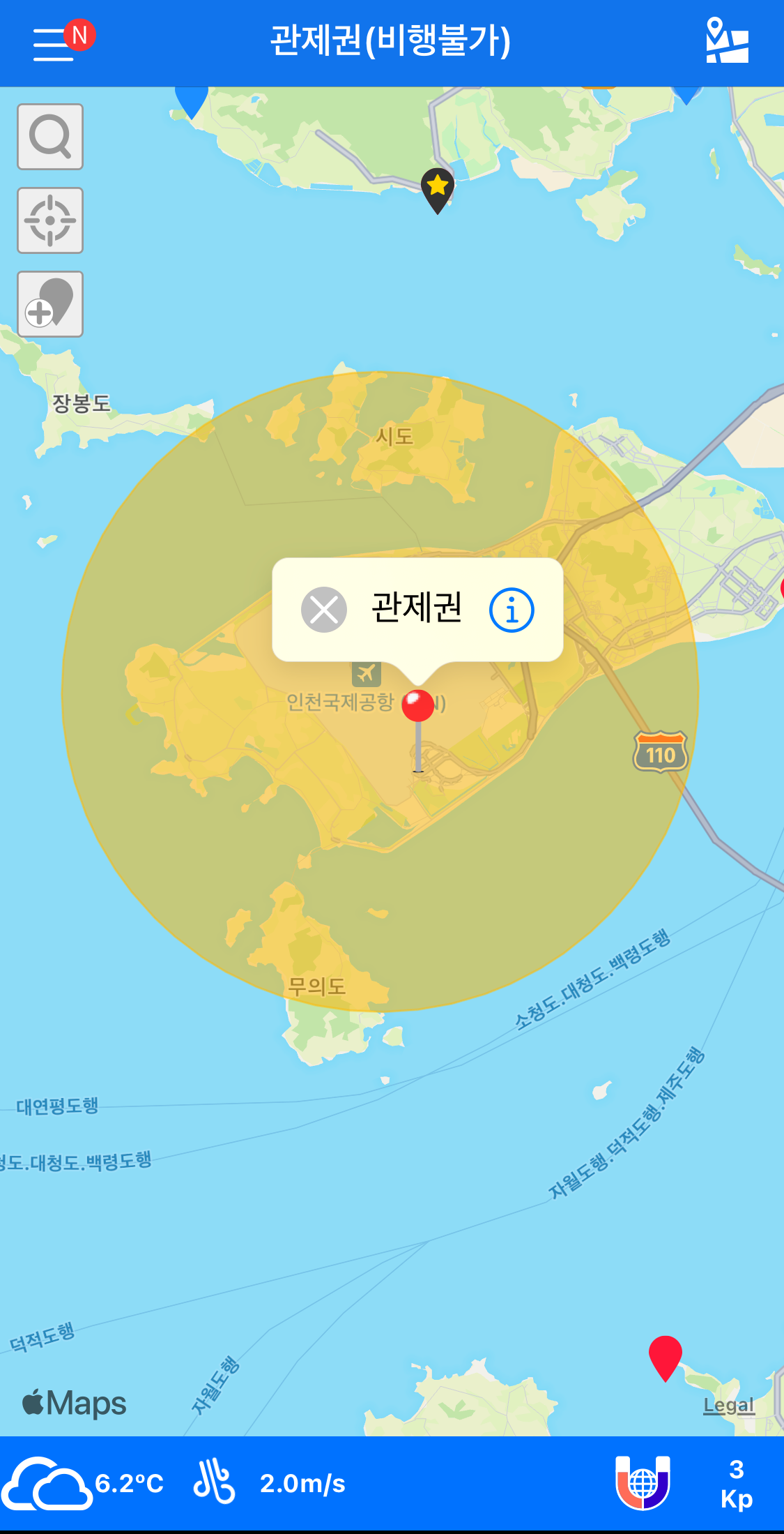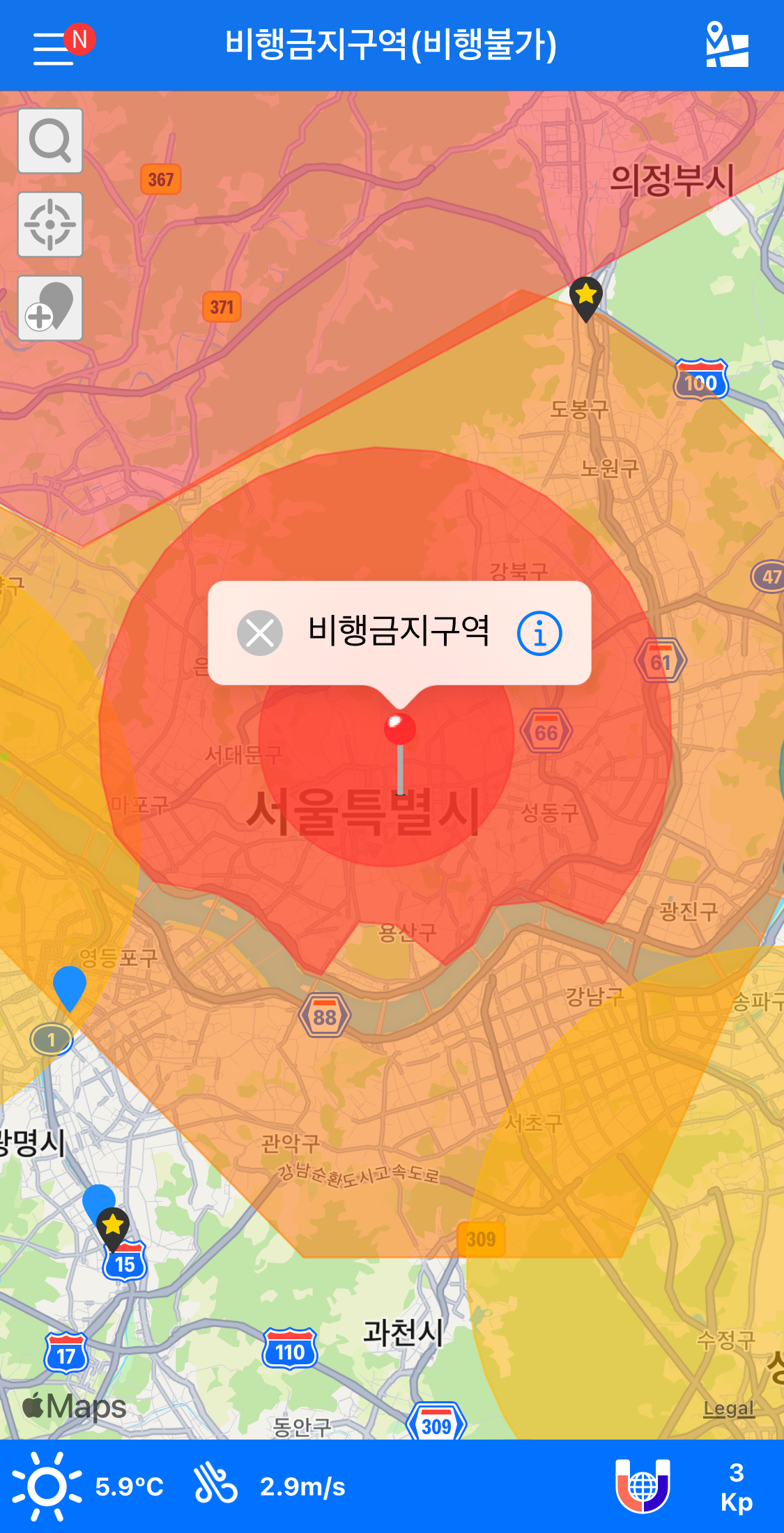 드론을 날리고 싶은 위치를 찾아서 그 부분을 클릭하거나 길게 누르면, 해당 공역(하늘)이 어떤 곳인지 설명이 뜹니다.