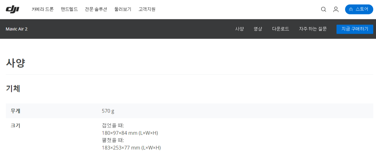 보통 인터넷에 '(드론 모델명) 사양'으로 검색하시면 해당 드론을 만든 제조사의 홈페이지에서 무게를 확인하실 수 있습니다.