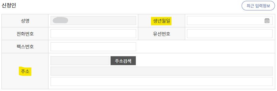 성명과 전화번호는 자동으로 채워집니다. 생년월일과 주소만 신청자 본인에 맞게 채워넣으시면 됩니다.