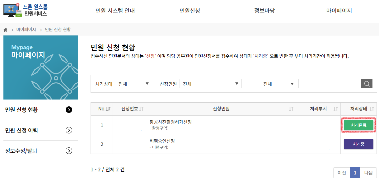 접수 후 3-4일 정도 뒤에 드론원스톱 민원서비스 웹페이지로 다시 들어가 로그인하신 뒤, 마이페이지 탭에서 '민원신청현황'을 클릭합니다.