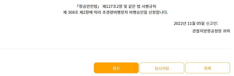- 초경량비행장치 제원및성능표: 앞서 준비한 제원 및 성능표(한글 파일)을 업로드