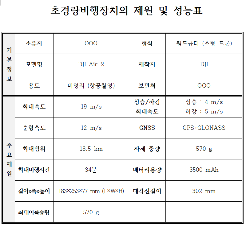 - 초경량비행장치 제원 및 성능표: 아래 첨부파일을 다운받아 열면 아래와 같은 양식이 나옵니다.