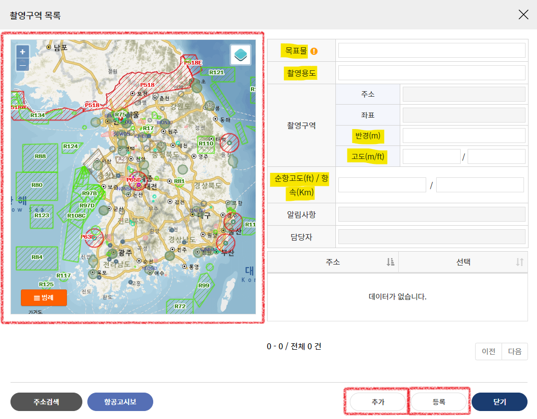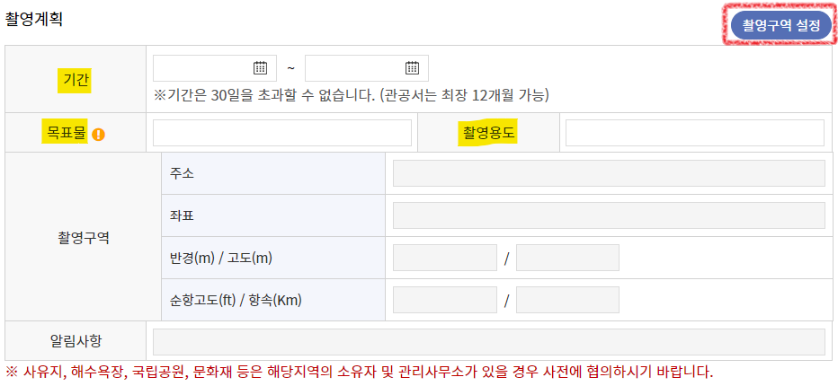 혹시라도 해당 지역을 촬영해야 하는 공익적인 사유가 있다면 그에 대한 증명 서류를 첨부하시면 됩니다.