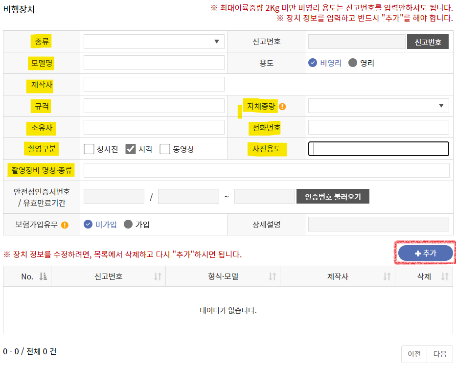 - 모델명, 제작자, 규격은 비행승인 신청을 할 때 작성했던 '초경량비행장치 제원 및 성능표'를 참고해서 입력하시면 됩니다.