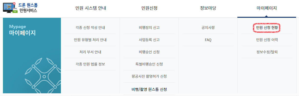 접수 후 3-4일 정도 뒤에 드론원스톱 민원서비스 웹페이지로 다시 들어가 로그인하신 뒤, 마이페이지 탭에서 '민원신청현황'을 클릭합니다.