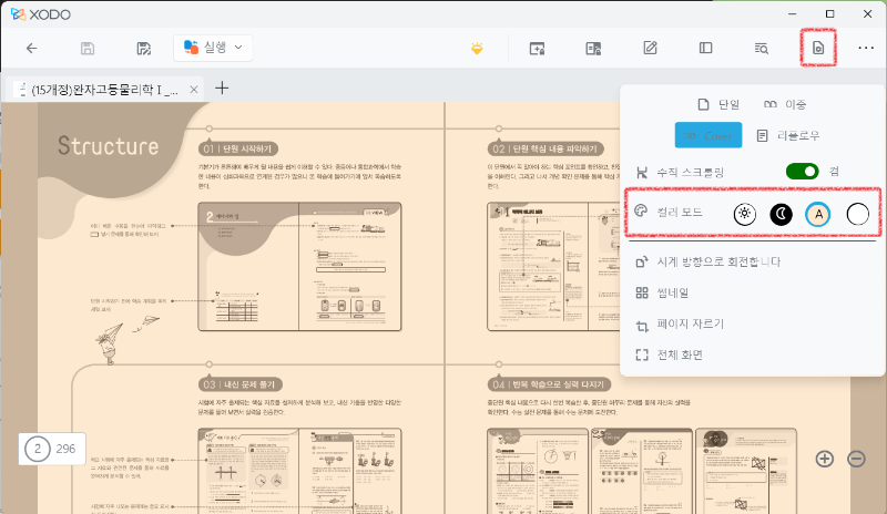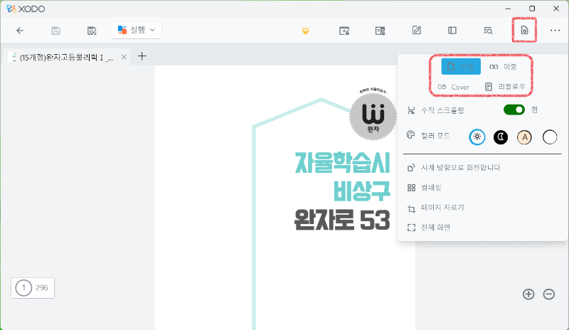 오른쪽 위에 있는 '보기 모드' 아이콘을 누르면 다양하게 PDF를 볼 수 있는 옵션이 있습니다.