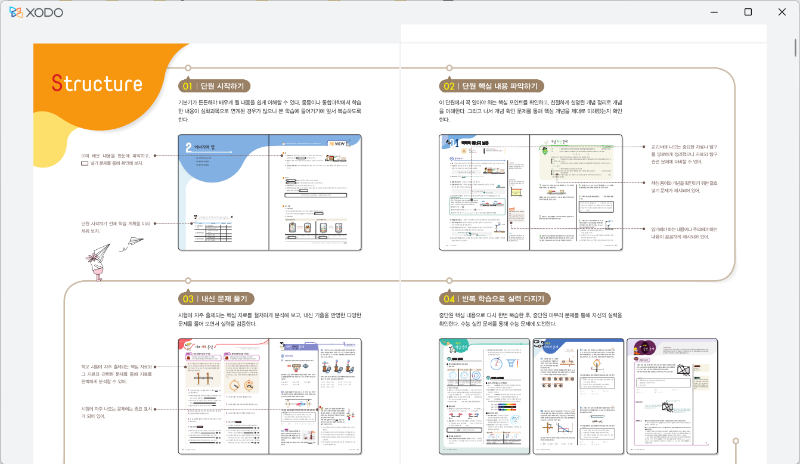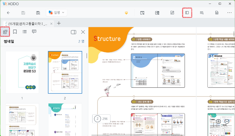 Xodo에서 해당 파일을 연 후 '책갈피' 옆의 '개요 보기'를 누르면 출판사에서 제공하는 책의 목차를 볼 수 있습니다.