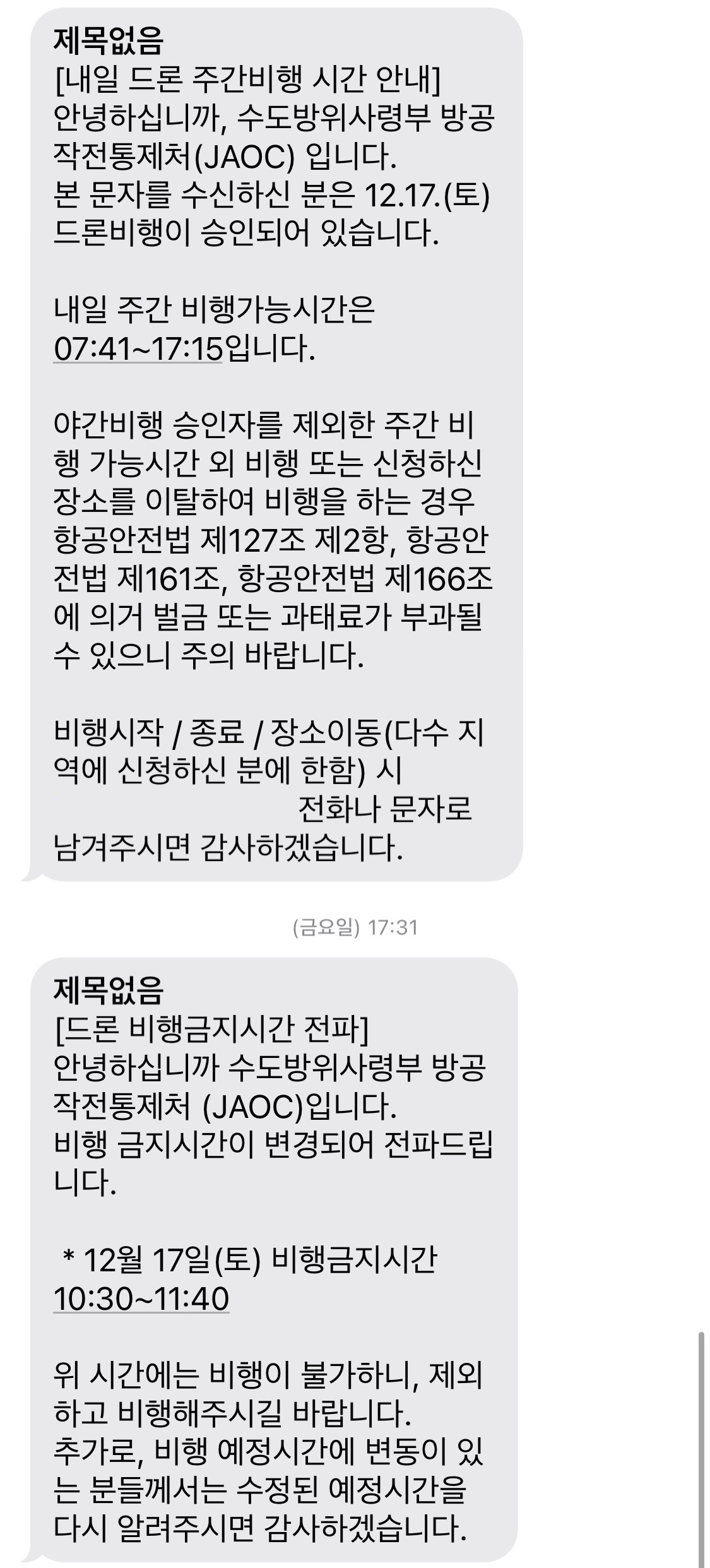 그리고 그 말대로 촬영일 하루 전부터 문자를 통해 수도방위사령부 방공작전통제처(JAOC)으로부터 주간비행가능시간과 비행금지시간에 대해 안내받을 수 있었습니다.