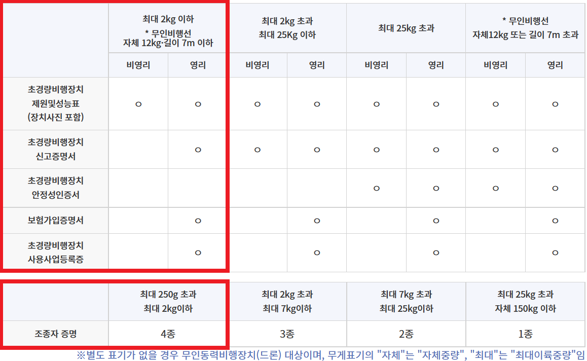 비영리 목적으로 2kg 미만의 드론을 날리는 저희는 초경량비행장치 사진, 초경량비행장치 제원 및 성능표, 조종자증명(드론이 250g 이상일 경우) 이렇게 세 가지가 필요합니다.