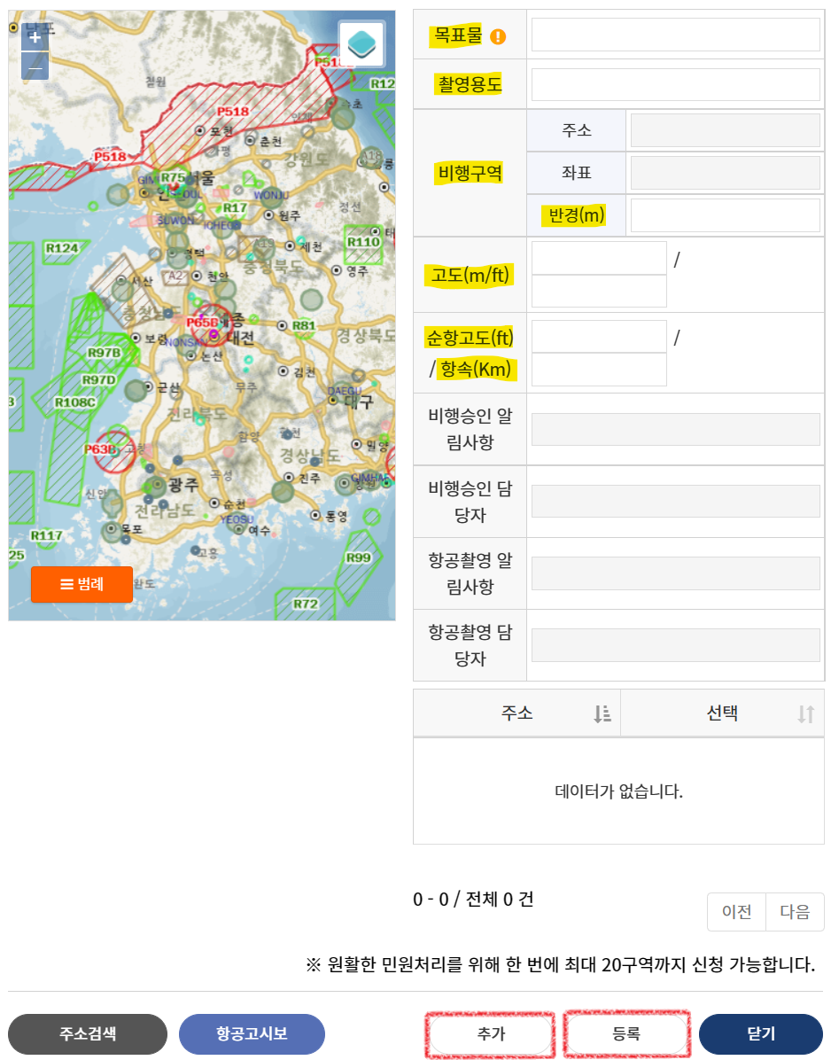 - 비행기간: 서울 이외의 지역에서는 최대 6개월, 서울 지역(R75 공역)에서는 최대 이틀의 원하는 기간을 설정하시면 됩니다.