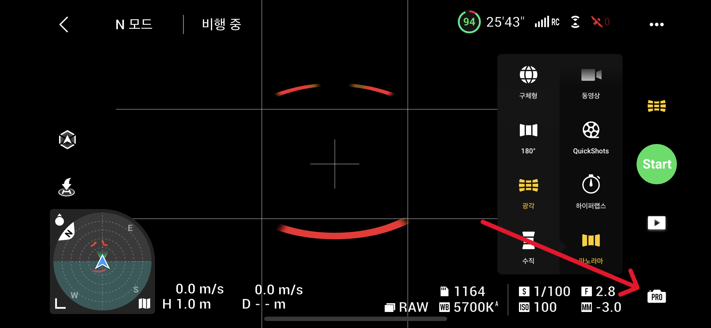 원하는 곳에서 드론을 이륙시키고 적당한 자리를 잡은 뒤, 아래 사진에 보이는 메뉴로 들어갑니다.